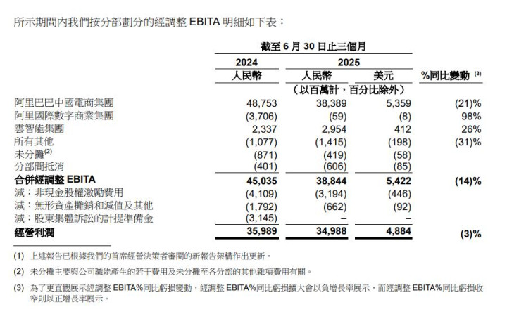 财报显示,阿里巴巴今年4月至6月实现营收2476.52亿元,同比增长2%;经营利润349.88亿元,同比下滑3%;非公认会计准则净利润335.1亿元,同比下降18%。